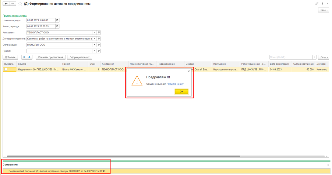 При нажатии на кнопку «Да» "Да" появляется окно «Создан "Создан новый акт» акт" с ссылкой для просмотра документа. Также внизу выходит сообщение «Создан "Создан новый документ Акт на штрафные санкции 000000001 от 04.09.2023 15:38:48». Рис48". 8