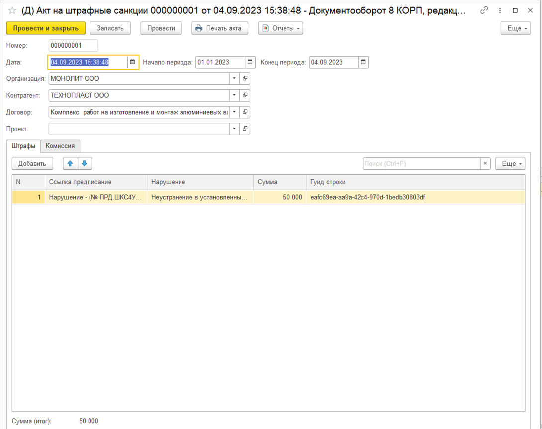 Создание документа «Акт на штрафные санкции»