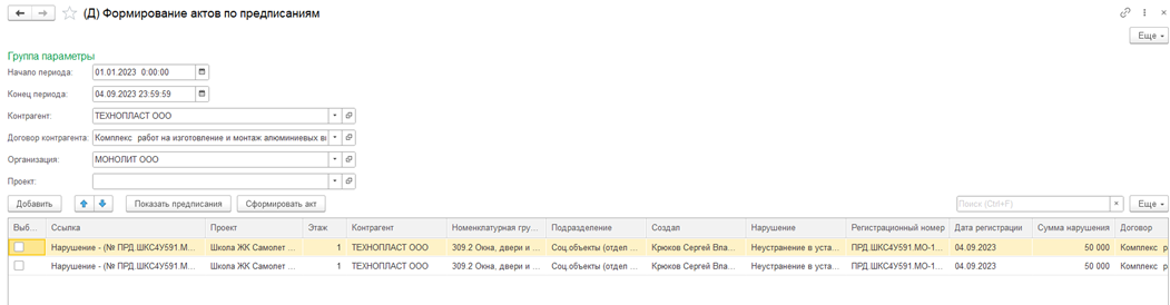 В списке предписаний установить флаг на те нарушения, по которым необходимо сформировать акт. Рис. 6