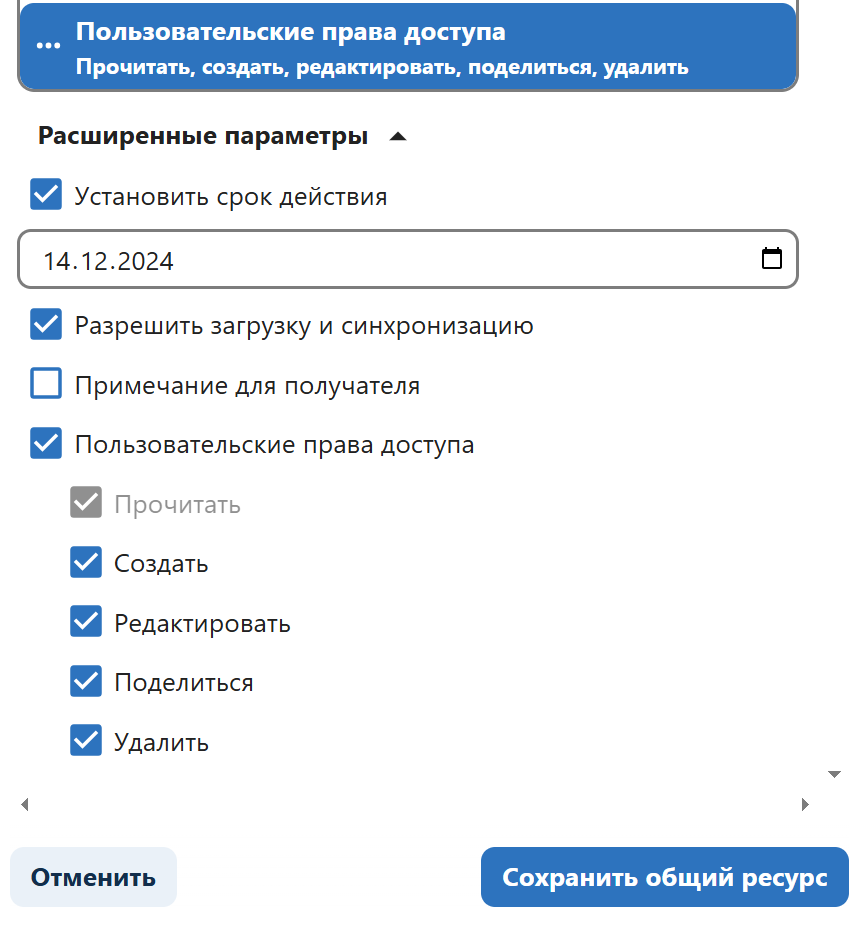 После выбора уровня доступа нажать кнопку "Сохранить общий ресурс".