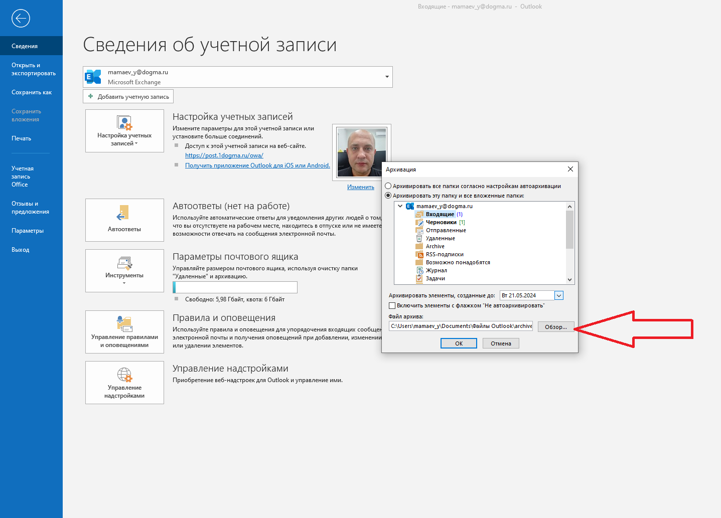 4. В архиве создаём нужные папки  и перетягиваем туда письма которые нужно заархивировать чтоб освободить место на сервере.