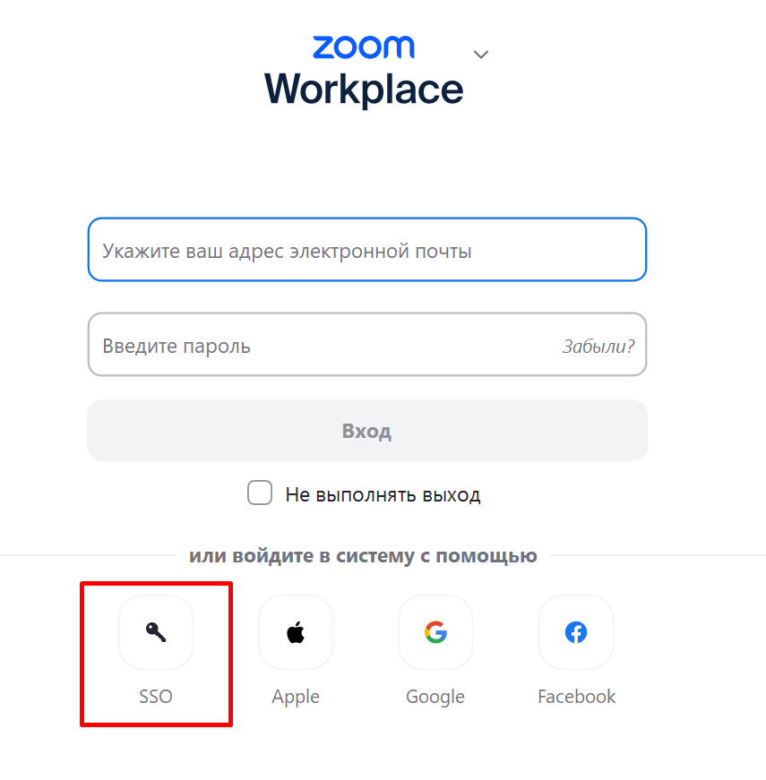 1. Для входа в Zoom через корпоративную учётную запись необходимо на главной странице авторизации приложения выбрать пункт SSO: