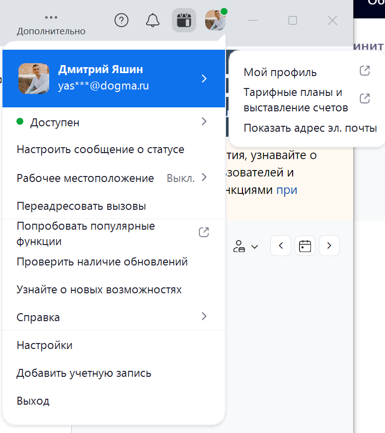 5. В открывшемся приложении убедиться, что верно отображается ваше имя пользователя и email. А при открытии пункта "Мой профиль" в браузере открывается страница dogma-ru.zoom.us: