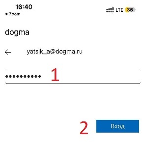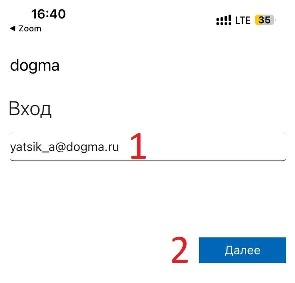 5. Нас перебросит на сайт dogma-ru.zoom.us, в котором необходимо ввести свою корпоративную почту (1) и нажать "Далее" (2)