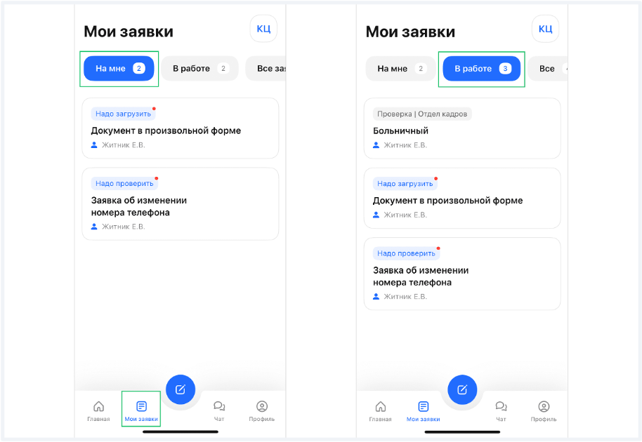 На мне — список заявок, которые требуют вашего согласования, подписания, заполнения или загрузки вложений. Это могут быть заявления от сотрудников, служебные записки или приказы, отправленные вам для выполнения определенного действия.