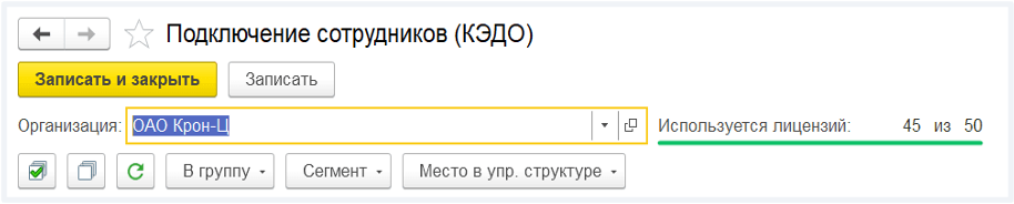 В 1C КЭДО → Подключение сотрудников доступна информация о количестве используемых и доступных лицензий в компании. Чтобы посмотреть цифры, выберите нужную организацию из списка.
