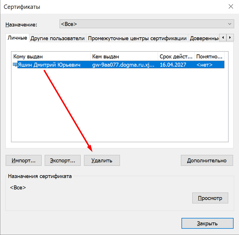 - В открывшемся окне выбрать сертификат с вашим ФИО и нажать кнопку Удалить