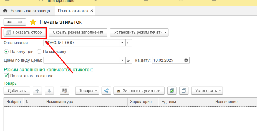 Если необходимо распечатать этикетку для определенной номенклатуры, необходимо указать ее в отборе.