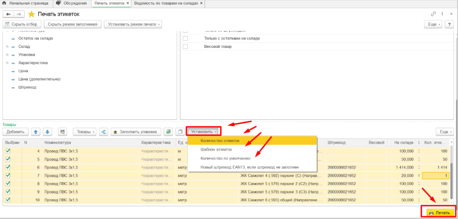 Важно! Если установим галку «По остаткам на складе» количество этикеток будет заполнено по количеством товаров на складе, соответственно это количество пойдет на печать.