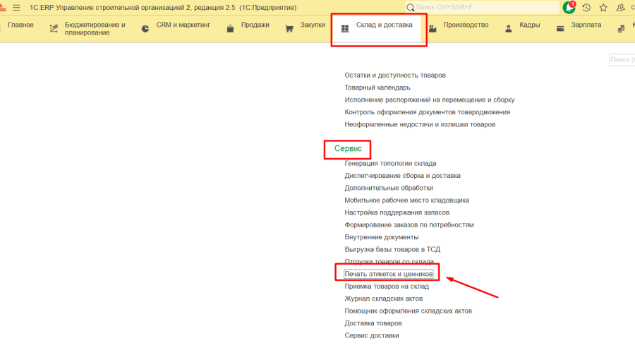 - Переходим в раздел «Склад и доставка – Сервис – Печать этикеток и ценников»