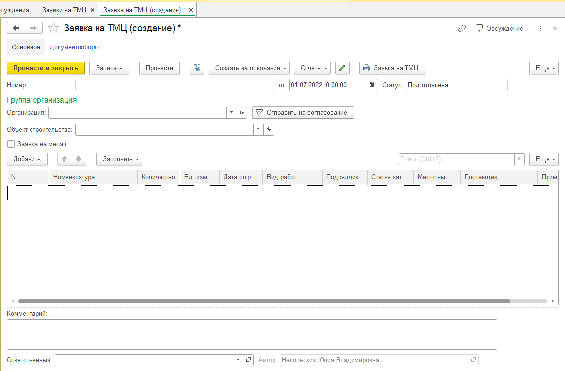 5. Заполняем: «Организация», «Объект строительства», «Заявка на месяц», табличную часть номенклатуры, «Ответственный» (см. рис. 4).
