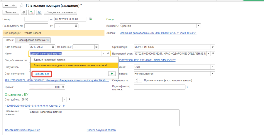 После заполнения поля "Налог" пользователю необходимо проверить все реквизиты платежной позиции на корректность заполнения.