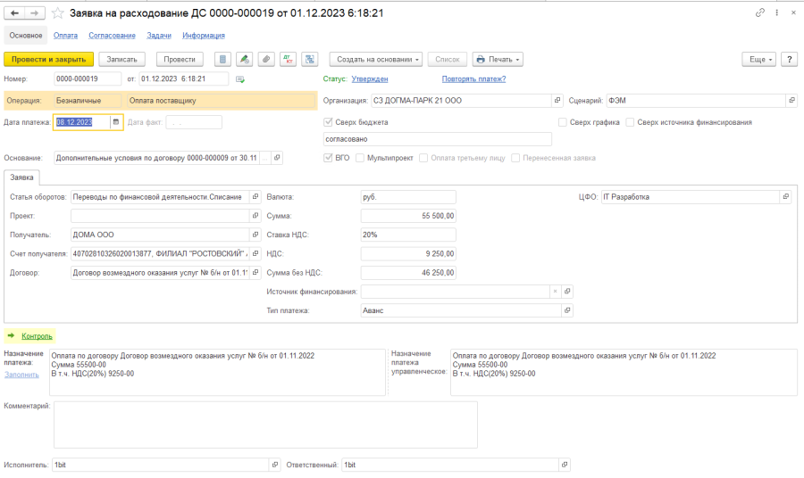 После загрузки Заявки в БИТ. Финанс пользователю необходимо проверить корректность заполненных реквизитов в выгруженных заявках и провести документ, таким образом отправив их на согласование.