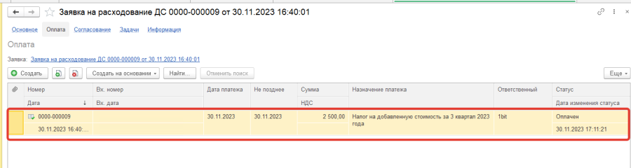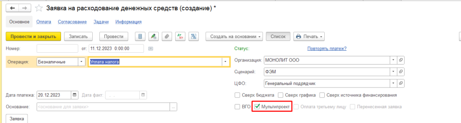 - Записать, закрыть платежную позицию. Вернуться по гиперссылке "Основное" в форму Заявки;