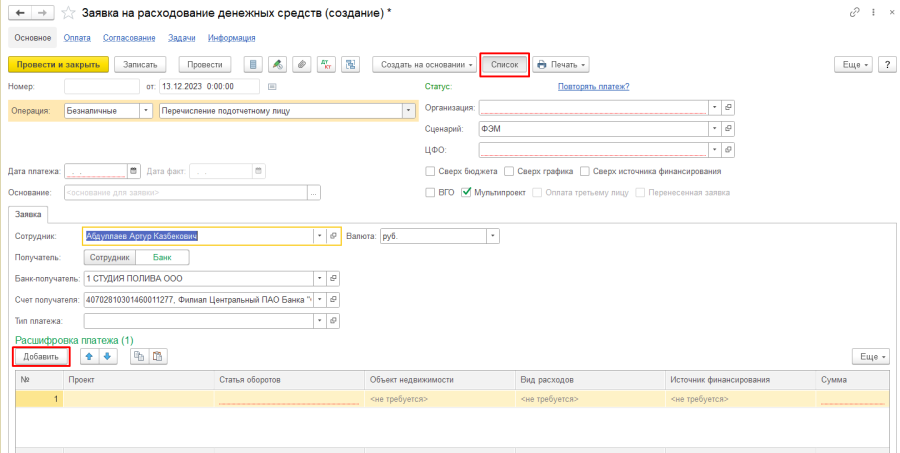 - Сотрудник, которому планируется перечисление ДС – значение реквизита выбирается из справочника "Физические лица";