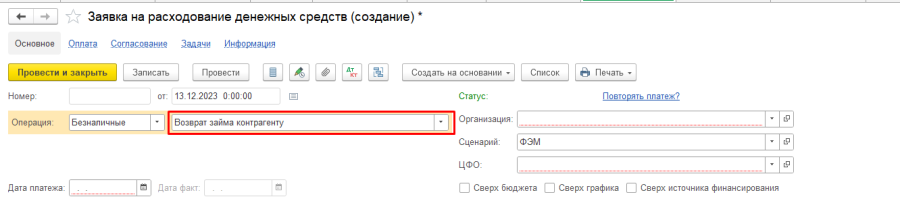 1. При формировании Заявки на расходование ДС по возврату займа/кредита или выдаче займа контрагенту пользователю необходимо выбрать одноименный вид операции "Возврат займа контрагенту", "Возврат кредита банку" или "Выдача займа контрагенту"