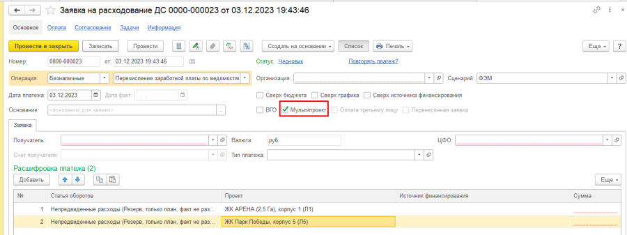 Система при добавлении строк с различными проектами автоматически присвоит ей флаг "Мультипроект".