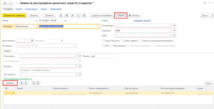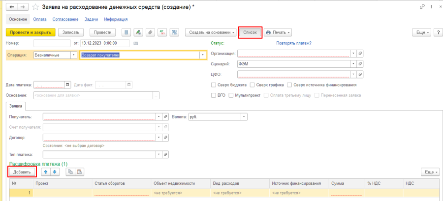 2. В форме документа "Заявка на расходование денежных средств" заполняются следующие реквизиты: