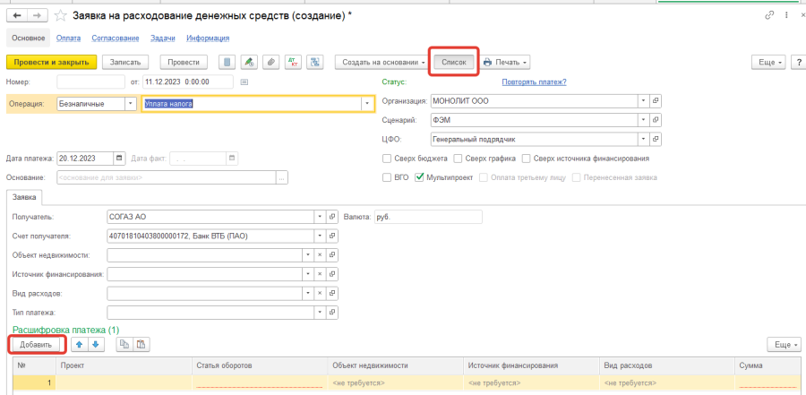 - Заполнить налоговые реквизиты платежной позиции: