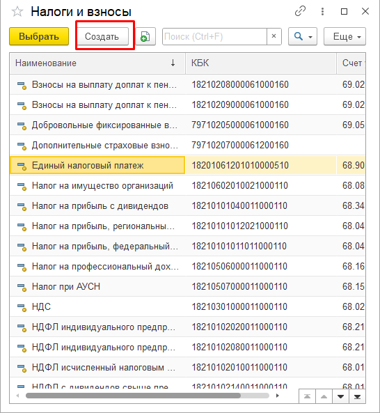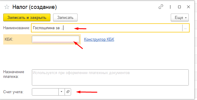 Далее указать наименование Налога, КБК и счет учета, записать и закрыть:
