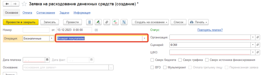 - При формировании Заявки на расходование ДС по возврату покупателю пользователю необходимо выбрать вид операции "Возврат покупателю"