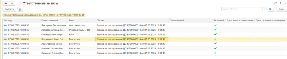 После проведения документа и отправки его на согласование формируются записи в регистре сведений «Ответственные за визы». В записи указывается: