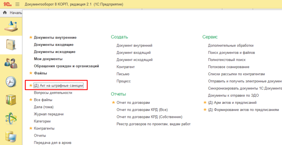 1. В 1С:Документооборот перейти в раздел – «Документы и файлы» - «(Д) Арм актов и предписаний». Рис. 1