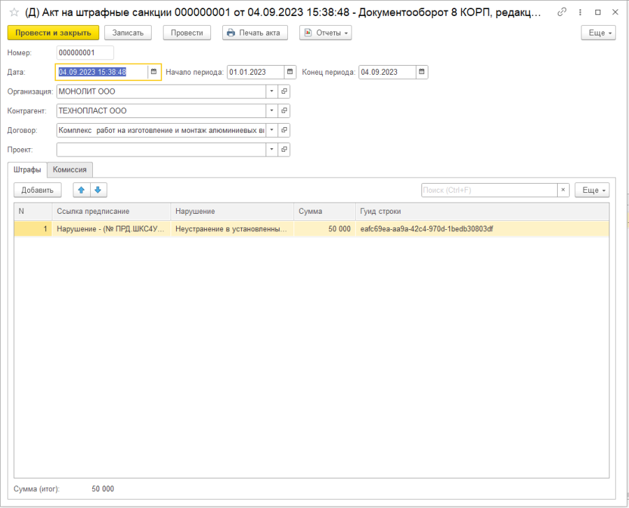 При нажатии на ссылку, откроется сформированный документ «Акт на штрафные санкции». Рис. 9