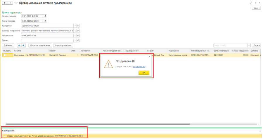 При нажатии на кнопку «Да» появляется окно «Создан новый акт» с ссылкой для просмотра документа. Также внизу выходит сообщение «Создан новый документ Акт на штрафные санкции 000000001 от 04.09.2023 15:38:48». Рис. 8