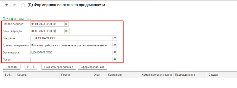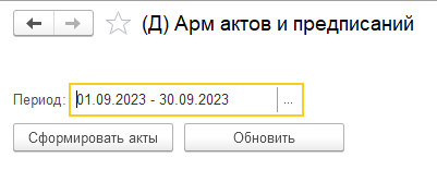 1. Откроется окно «(Д) Формирование актов по предписаниям».