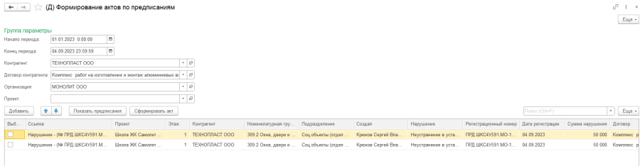 В табличной части сформируется список нарушений согласно установленному отбору. Рис. 5