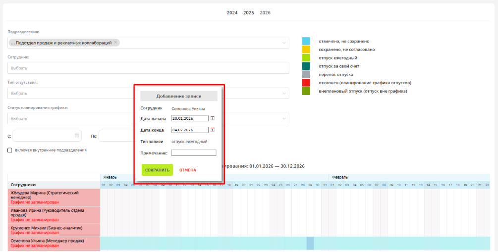 Шаг 3. На открывшейся странице выберите корректный год для планирования. Период планирования будет указан над таймлайном распределения дат отпуска: