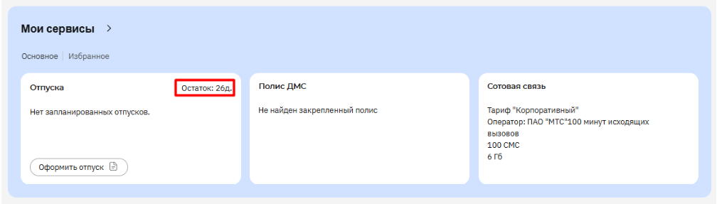 Просмотр остатка дней отпуска осуществляется в виджете «Отпуска», расположенном в блоке Мои сервисы Личного кабинета сотрудника: