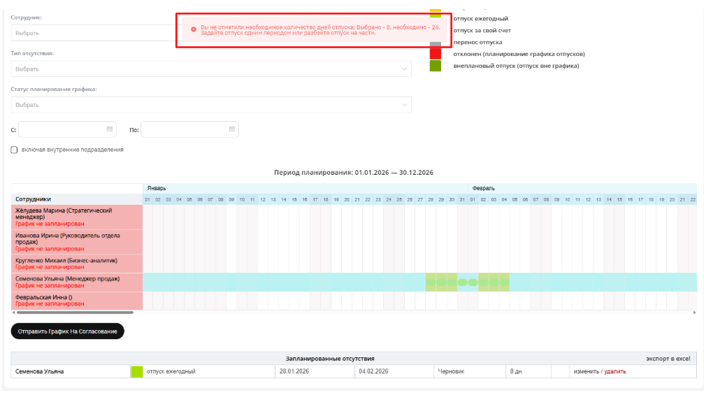 Важно: Система не позволит отправить график на согласование до тех пор, пока все доступные дни отпуска не будут распределены.