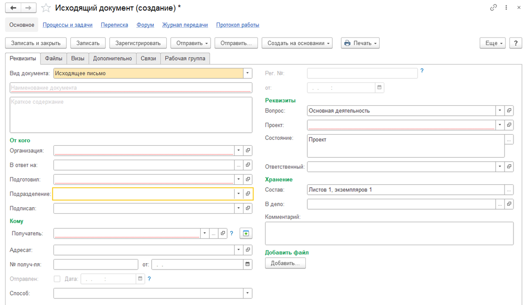 Для создания исходящего документа необходимо произвести следующие действия: