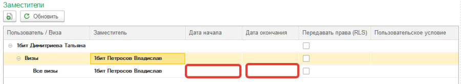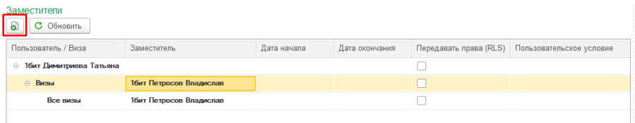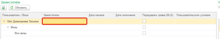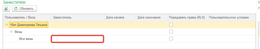 Если необходимо установить одного заместителя по всем визам и ролям пользователя, то заместитель указывается на верхнем уровне группировки "Пользователь".