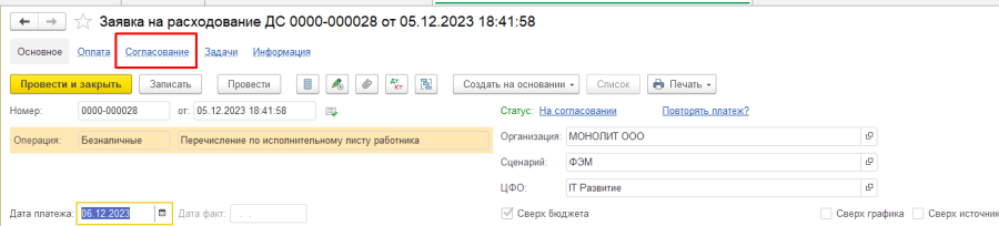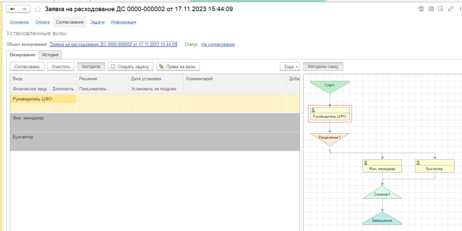 В момент проведения документа "Заявка на расходование ДС" приобретает статус "На согласовании" и автоматически направляется на согласование ответственным лицам по назначенным маршрутам. Реквизиты документа становятся недоступными для изменения. В случае, когда необходимо исправить реквизиты Заявки, документ должен быть распроведен. При повторном проведении маршрут согласования будет сформирован заново.