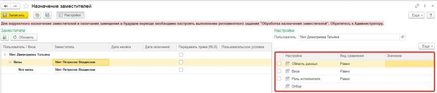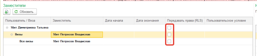 - Флаг "Передавать права (RLS)" устанавливается, если заместителю необходимо назначить права на значения областей доступа, которых ему недостаточно для замещения. Например, у заместителя нет доступа к документам по Проектам, ЦФО или статьям оборотов, которые доступны согласующему.