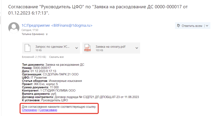 При проведении Заявки на расходование ДС ответственным за согласование пользователям придет уведомление на почту о необходимости согласования ЗРДС. Так же к письму приложены файлы, прикрепленные к заявке, и форма заявки на оплату. Согласование происходит по нажатию гиперссылки в теле письма.