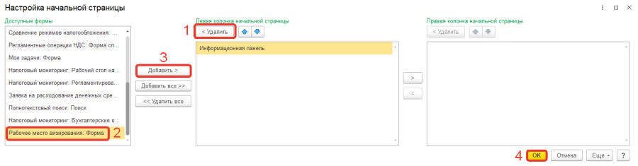 Далее удалить лишние разделы (необязательно), найти в Доступных формах "Рабочее место визирования. Форма" и Добавить: