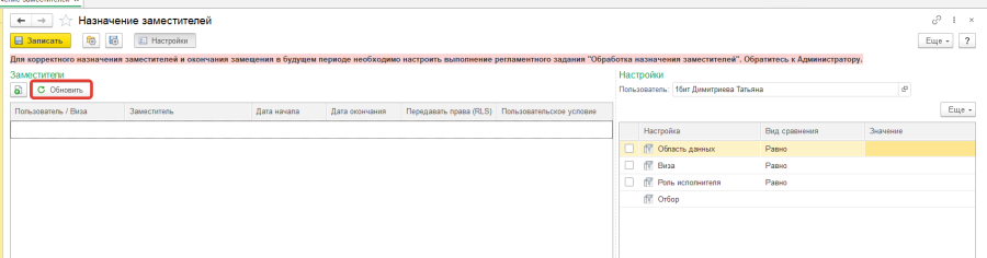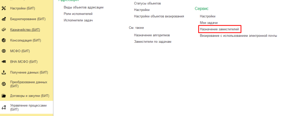 Для назначения заместителей по визированию при временном отсутствии сотрудника (уход в отпуск, на время болезни и т.п.), предназначена обработка "Назначение заместителей" (раздел "Управление процессами").