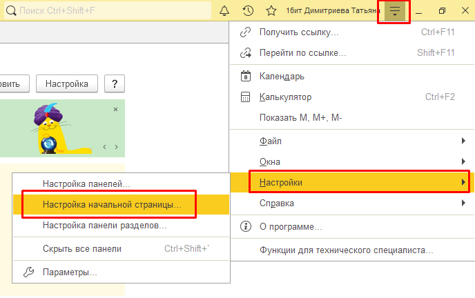 Рабочее место казначея можно добавить на начальную страницу программы . Для этого, необходимо перейти в Настройки начальной страницы своего пользователя: