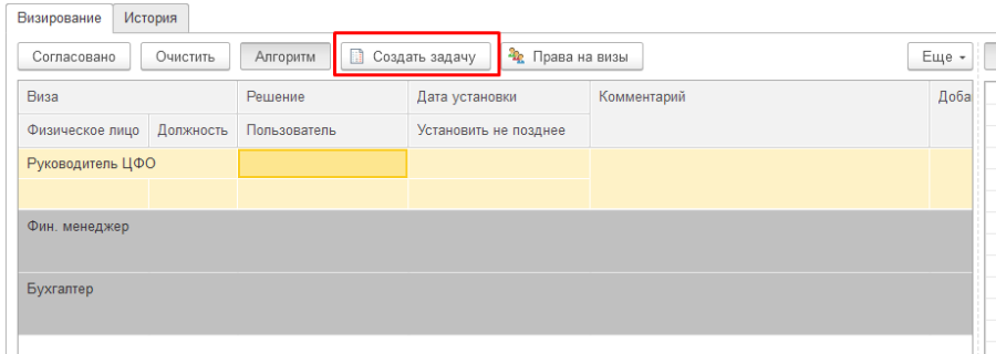 Каждый согласующий по документу в форме "Установленные визы" (вызов по команде "Согласование") может создать Задачу исполнителю по кнопке "Создать задачу". При этом в Задаче будет присутствовать ссылка на текущий документ и на конкретную визу, по которой она создана: