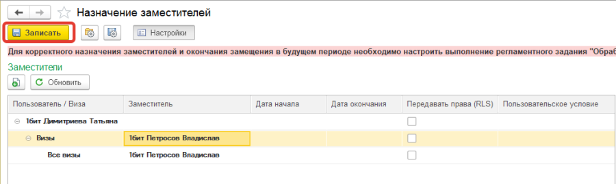- В колонке "Заместитель" выбрать пользователя-заместителя, при этом можно указать по каждой визе или роли отдельного заместителя, либо одного заместителя для всех виз и всех ролей.