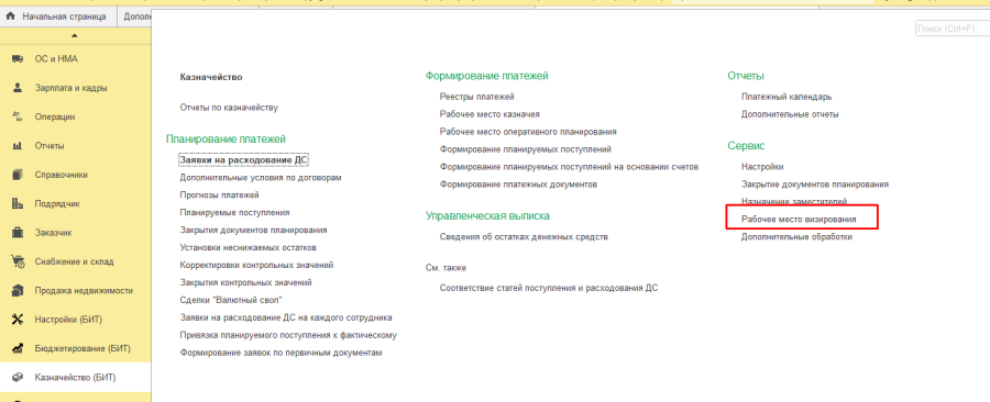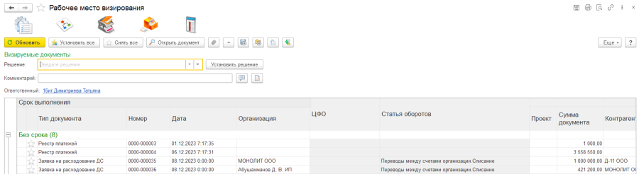 Обработка "Рабочее место визирования" (раздел "Казначейство" - "Рабочее место визирования") предназначена для осуществления визирования всех типов документов в эргономичной форме.