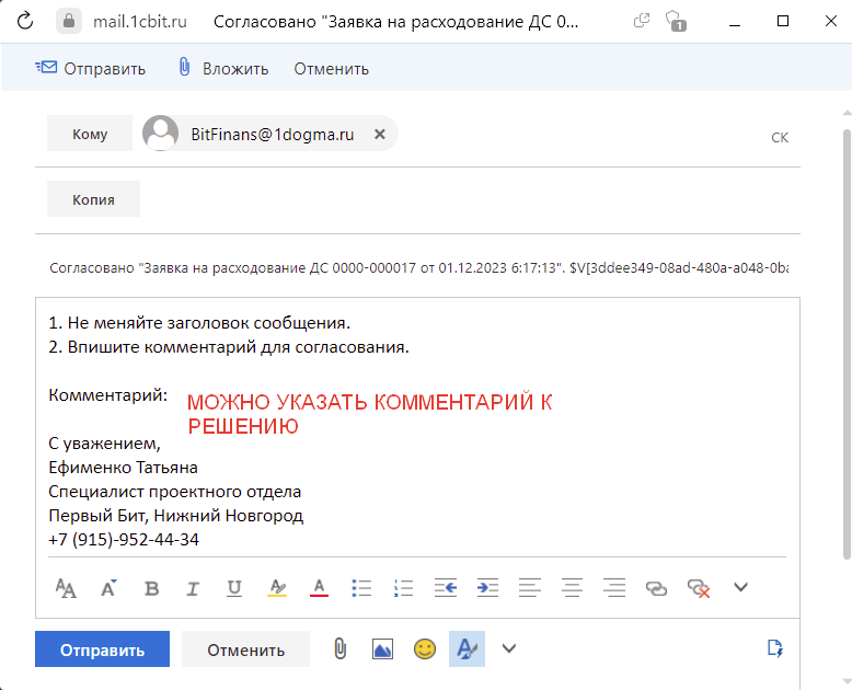 После заполнения комментария (необязательно) письмо необходимо отправить. Решение с комментарием автоматически перейдет на вкладку "Согласование" в ЗРДС.