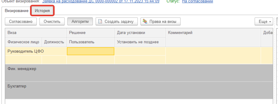 По команде "Согласование" происходит переход в форму, в которой осуществляется визирование документа: