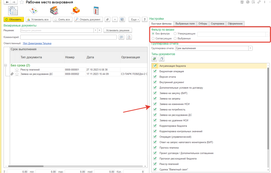 В поле "Фильтр по визам" можно выбрать, по каким визам будет производиться отбор: