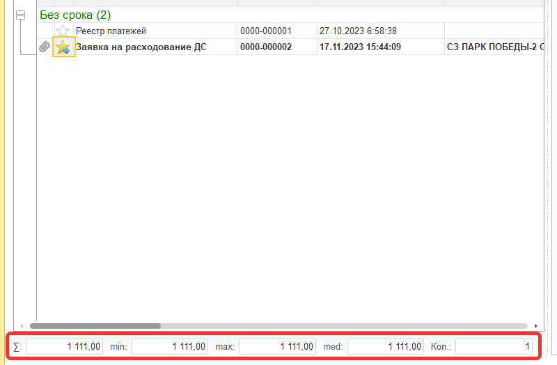 Помимо этого, в нижней части таблицы указываются количественно-суммовые показатели выбранных документов. В их число входят: сумма, минимум, максимум, среднее и количество.