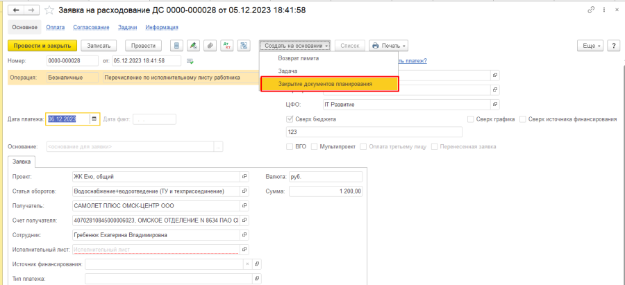 В случае, если заявку не предполагается передавать в оплату, необходимо её аннулировать. В таком случае на основании заявки создается "Закрытие документов планирования"